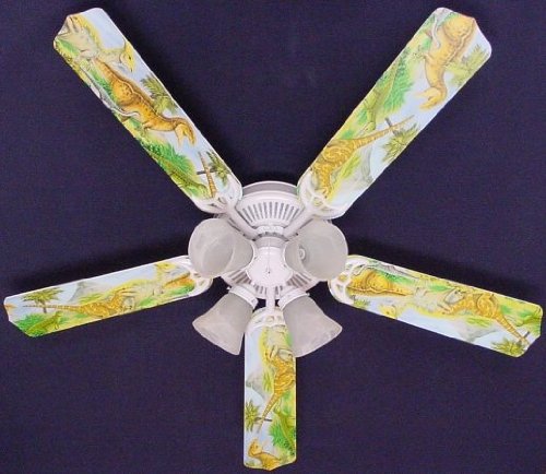 Product Descriptionp/pAdd a designer touch to your child's dinosaur theme bedroom or playroom with the Dinosaurs ceiling fan. The ceiling fan blades feature all your favorite Jurassic dinosaurs, including T-Rex, roaming prehistoric lands in pleasing colors of greens, blues, tan and a touch of brown. br br The hand crafted Dinosaurs 52 Hugger Ceiling Fan with Schoolhouse Style Light is perfect for a bedroom or playroom. It has a convenient three speed switch for year round comfort. Summer-forward air motion creates cooling breeze and winter-reverse air flow recirculates rising warm air