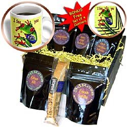 Buying Frog I see You Coffee Gift Basket is measuring 9x9x4. Contains 15oz mug, BONUS free set of 4 coasters, biscotti and 5 blends of gourmet coffee. French Vanilla, Kenya AA, Decaf Colombian Supremo, Chocolate and Italian Roast Espresso elegantly presented in our signature black planet coffee gift box. A very nice and thoughtful gift for any occasion. sale