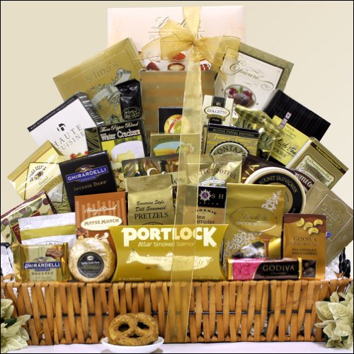 Buying Impress your most important clients or friends with this elegant and distinct gourmet gift basket. Includes a large assortment of premium, upscale gourmet chocolates, cookies, cheeses, crackers, meat, nuts, snacks, candy and more. Features a generous assortment of premium Godiva, Lindt & Ghirardelli chocolates, Harry & David confections, Tuscan olive cheeseball mix, smoked salmon, Creme Brule coffee, Sonoma Cheese Straws, Bavarian Dill Pretzels, lemon almond biscotti and so much more. sale