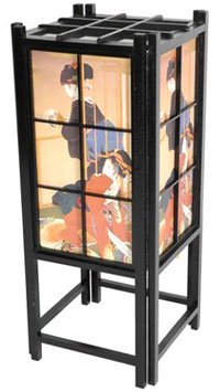 Attractive variation of classic Japanese paper lantern. Pressed pulp rice paper shade w/ whimsical Geisha design. Creates a soft, warm glow in any room. UL approved wiring, socket, and switch for 25W bulb, ships in 48hrs from our Massachusetts warehouse via FedEx, expedited delivery available.