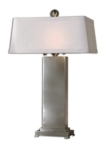 This lamp features satin nickel metal and is topped with a rectangular,ivory linen, hardback shade.