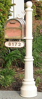 Address Plaque is included with Mailbox Post as in shown picture. With an Address Plaque, numbering on the mailbox is unnecessary. Posts are intended to be mounted in cement using either J-bolts or Red-Head type bolts. Made from aircraft grade aluminum tube and U.S. cast aluminum components, using custom patterns. Each component is full seam bead welded to the pole on top and bottom, resulting in a unibody appearance and feel. All components are reinforced to eliminate the potential for bending and breaking. Address plaque is 4" x 12", made of cast aluminum with raised 2" high