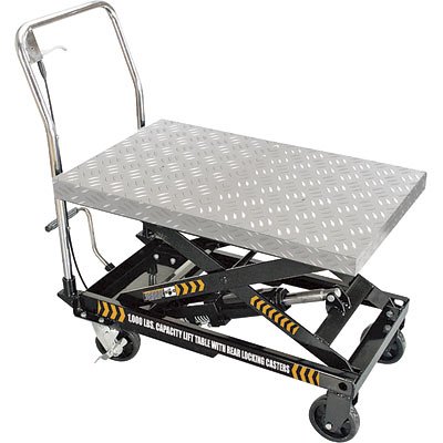 Hydraulic foot pedal pump for smooth lifting and slow release valve in handle for controlled lowering with heavy loads. Minimum height: 11in.; maximum lift height: 33 7/8in. Double ball bearing neoprene swivel casters (2 locking). Chrome handle and aluminum treadplate top for safely securing loads. Load Capacity (lbs.): 1,000, Raised Height (in.): 33 7/8, Lowered Height (in.): 11
